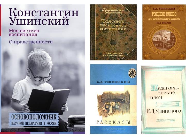 •К.Д.Ушинский еңбектерінің жетістігінің бірі — бастауыш оқыту мәселесін мейлінше зерттеді. Оның негізгі еңбектері: “Сауат ашу — білімді кеңейту құралы” (1858), ”Балалар әлемі мен Хрестоматия”, “Оқу кітабы. Ақыл-ойды жаттықтыруға арналған табиғат әлемімен біртіндеп танысу” (1865), “Алғаш орыс тілін оқыту” (1864) оқушыларға арналған “Ана тілі” және “Ана тілін оқытуға ата-аналарға кеңес” (1864).
