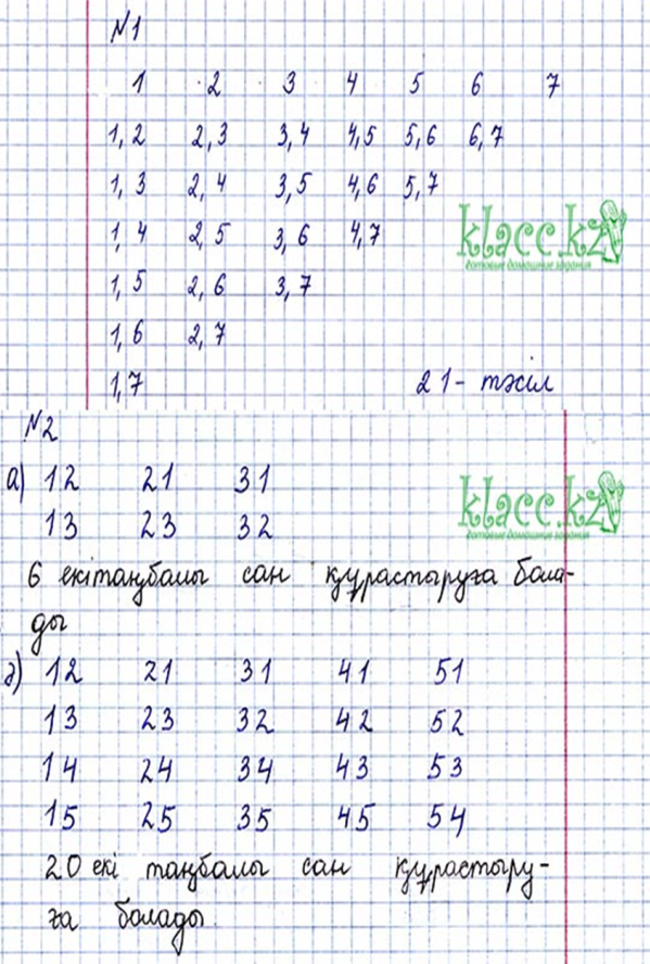 №2 есеп 1-нұсқа. Шешуі: 12, 13, 21, 23, 31, 32. Жауабы: 6 екі таңбалы сан жазуға болады. ЕБҚ 2-нұсқа. Шешуі: 12, 13, 14, 15, 21, 23, 24, 25, 31, 32, 34, 35, 41, 42, 43, 45, 51, 52, 53, 54. Жауабы: 20 екі таңбалы сан жазуға болады. №3 ЕСЕП