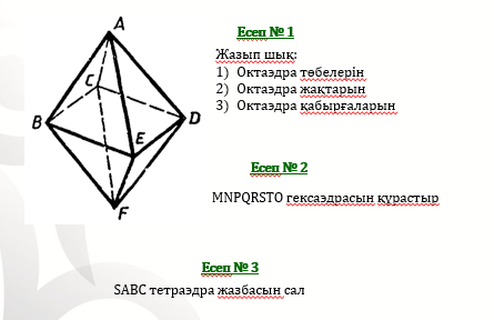 Кестені толтырып, оны Эйлер теоремасымен (формуласымен) тексереді. Т + Ж = Қ + 2, мұндағыҚ – қырлар саны, Т – төбелер, Ж–жақтар.