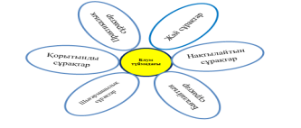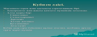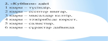 Жазылым Айтылым Топқа бөлініп, тапсырмаларды орындайды. 1-топ: Автордың ойы-не?» деген сұраққа «Кубизм» тәсілін қолданып жауап береді.