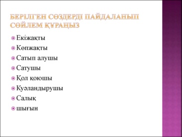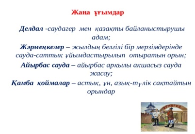 Айтылым Делдал-посредник Басымдық-превосходство Екіжақты-двусторооние Мәміле-сделка, компромисс Барлық-весь, все Сауда-торговля Тарихы-история Айтылым Суретке қарап, сұраққа жауап береді. Болжайды.