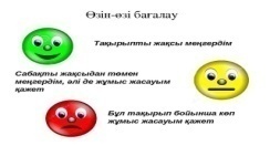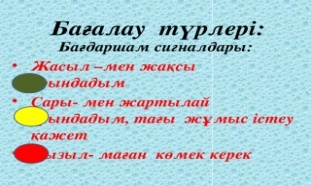 Мұғалім оқушылардың сабаққа қатысқан белсенілігіне қарай 1-10 баллдық жүйе бойынша әр оқушының өзіне тиісті баллын қойып бағалайды. Сонымен қатар, оқушыларды ынталандыру үшін «Қошеметтеу» әдісі |