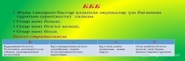Жазылым Мәтін мазмұны бойынша бір-бірлеріне сұрақ қояды. Оқылым Жазылым Терминдердің мағынасны анықтап, талдайды. Оқылым Жазылым «Инсерт» тәсілі. |
