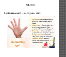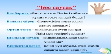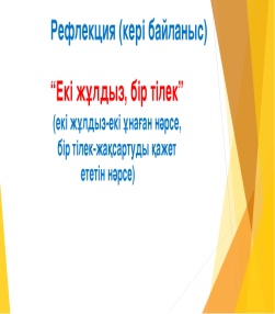 Оқушылар бүгінгі сабақтың мақсаты, тақырыбы бойынша өз ойын айту арқылы сабаққа қорытынды жасайды. Рефлексия: