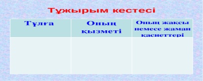 3-топ: «Дәстүрлер» сөзінің әрбір әрпіне сөз құрастырады. Үлгі: Даналық,әсемдік,салт,табиғи,үрдіс,рухани,лезде,ерік,рақым. Және осы сөздердің антоним,синоним,омонимдерін жазады. Жазылым Айтылым Интербелсенді тақтада берілген кесте бойынша жұмыс жасайды. |