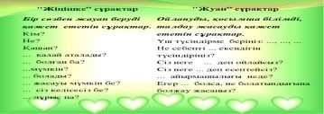 Бір-біріне сұрақтар қояды. Сыныптастырының пікірін толықтырады. Өз ойымен бөліседі. Осы тапсырманы орындау арқылы оқушылардың айтылым дағдысы қалыптасады. |