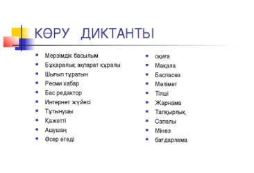 Жазылым Құрал-средство Тарату-распространять Сапалы-качественный Теру-набирать Сурет-рисунок Әртүрлі-разнообразный Ми-головной мозг Зиян-вредный Ағза-организм Әлем-мир |