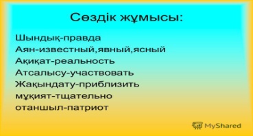 Жазылым Тарих-история-history Қызмет-служба-service Тілін табу-угодить-please Замануи-современный-modern Құрал-средство-way Жас ұрпақ-юное поколоение-young generation Лайық-достойный-worthy Білімді-образованный-educated Білікті-квалифицированный |