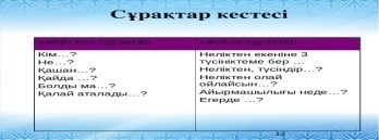 Тыңдалым Оқылым Мәтінді оқиды. Топқа бөлініп, мұғалім ұсынған тапсырманы орындайды. 1-топ: «Блум таксономиясы» бойынша мәтінмен жұмыс жасайды 2-топ: «Дискуссиялық карта» арқылы мәтіндегі ұнаған, ұнамаған тұстарына түсінік береді. 3-топ: «6 неліктен» тәсілін қолданып сұрақтар жазады. Жазылым Бағандағы сөздердің мағынасын анықтайды. |