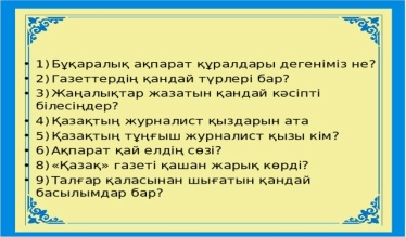 (Ұ) «Миға шабуыл» әдісі арқылы өткен тақырыппен жаңа сабақты байланыстыру мақсатында ой қозғау сұрақтарын ұжымдық талқылау. Мұғалім оқушыларға сабақтың тақырыбы, мақсатымен таныстырады. |