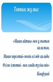 12- тапсырма: Жұптық жұмыс Оқулықта берілген тапсырмаларды орындатады, бақылайды, мысал береді. 8-тапсырма Топтық жұмыс