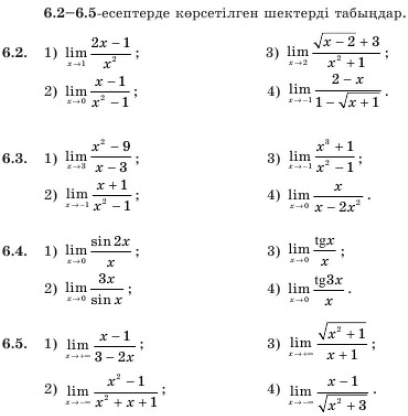 10.4.1.11 - функцияның шексіздіктегі шегінің қасиеттерін қолданып сан тізбектерінің шектерін табу; |