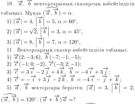 10.4.16 - координаталық түрдегі векторлардың скаляр көбейтіндісі формуласын білу және оны есептер шығаруда қолдану; |