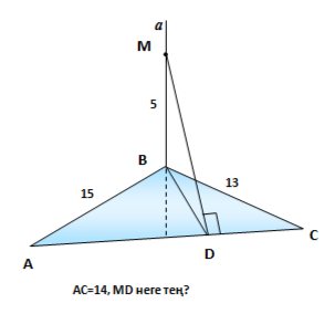№4 Берілгені: ABC – үшбұрыш. a түзуі үшбұрыш жазықтығына перепндикуляр. AB=15 , ВС = 13 , AC = 14, МB = 5 болса MD неге тең?