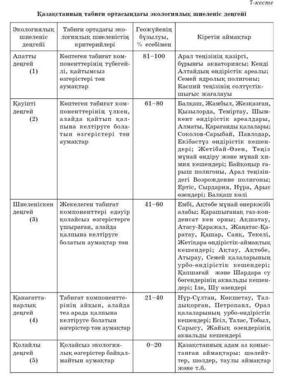 2-тапсырма. Сұрақты мұқият оқып, жауап беріңіз. А) Сіз тұратын аймақтың экологиялық жағдайы экологиялық шиеленістің қандай деңгейіне сәйкес деп санайсыз? В) Бұл деңгейге сәйкес деп санауыңыздың себебін түсіндіріңіз. С) Сіздің аймақта экологиялық мәселені шешу үшін қандай іс – шаралар жүргізілуде? D) Сіз экологиялық мәселені шешудің қандай жолын ұсынасыз? https://www.opiq.kz/kit/51/chapter/4154 қосымша ақпарат көзі Жалпы сыныпқа сұрақтар: