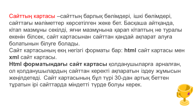 xml форматындағы сайт картасы іздеу жүйелері үшін қажет, іздеуші робот сайттағы барлық сілтемелерді көріп, сайтты индекстейді. Негізінде екі форматтағы сайт картасында құрған дұрыс: роботтар үшін –sitemap.XML және қолданушылар үшін sitemap.HTML. Sitemap файлының көмегімен Google, Яндекс секілді іздеу жүйелеріне сайттың қандай беттерін индекстеу керек, сайттағы ақпарат қаншалықты жиі жаңарып отырады, сайттың қай беттерін индекстеу маңызды екендігін хабарлауға болады.