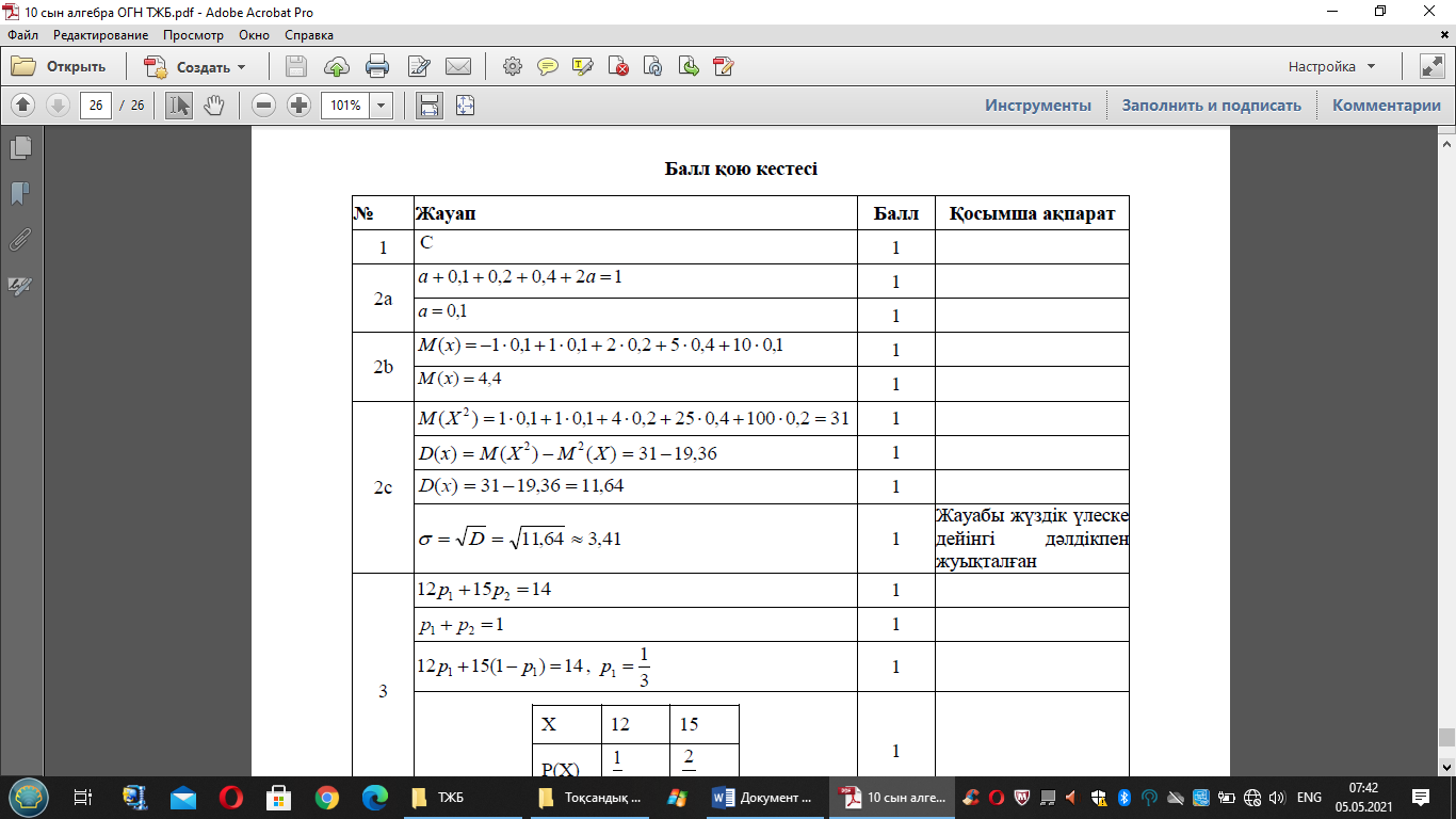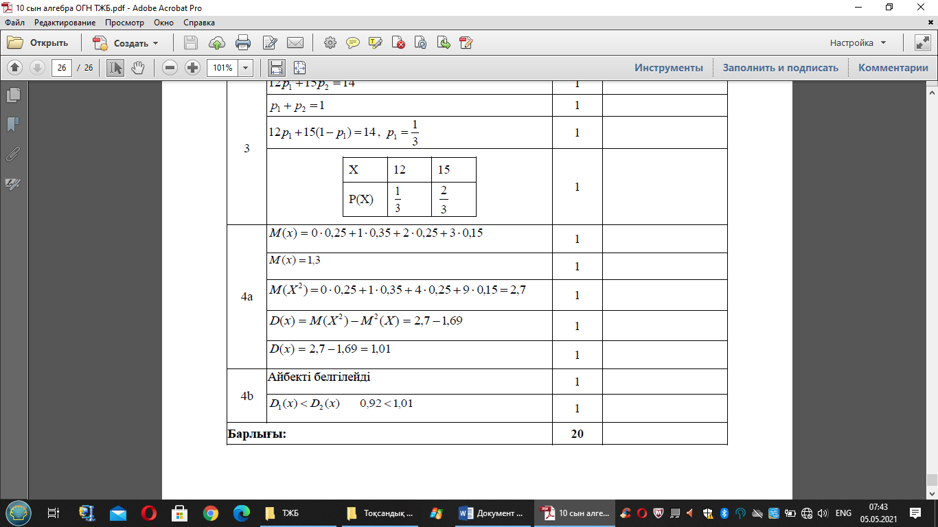 3. Х кездейсоқ шамасы 15 және 12 мәндерін қабылдайды. Математикалық күтімнің 14 екені белгілі. Х кездейсоқ шамасының үлестірім заңдылығын құрыңыз.