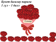 Мадақтаулар арқылы бағалап отыру ҚБ: «Гүл»әдісі Дескриптор: Өткен тақырып бойынша біледі-2Б ҚБ: «Гүл»әдісі Дескриптор: Мәтінді тыңдап, өз пікірін айтады-1Б Сан есімдерді тауып, талдау жасайды-1Б Етістік шақтарын табады-1Б ҚБ: «Гүл»әдісі Дескриптор: Шығарма мазмұнын түсінеді-1Б Мазмұндама жазу үшін жоспар құрады-1Б ҚБ: «Гүл»әдісі Дескриптор: Шығарма мазмұнын біледі-1Б Тыңдаған мәліметтер бойынша мазмұндама жазады-1Б Мазмұндама жазу ережесін түсінеді-1Б Жарайсыңдар «Телефон» әдісі |
