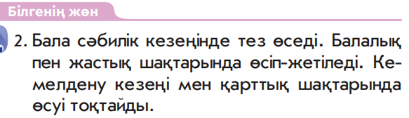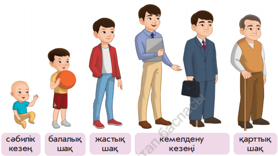 (Ұ) 1- тапсырма «Еркін әңгіме» әдісімен орындалады. А) Сөздікпен жұмыс. • сәбилік кезең • балалық шақ • жастық шақ • кемелдену кезеңі • қарттық шақ Ә) «Кел, ойланайық». Суретке қараңдар. 1. Сендер сәби кезінде қандай болдыңдар? Ал қазір қандайсыңдар? Өзгеруіңнің себебі неде?
