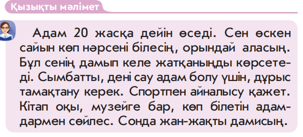 Зерттеу. Адам өскен сайын қандай өзгерістер болады? Кез келген жаста денсаулық мықты болуы үшін не істеу керек? Ә) Ойлан!