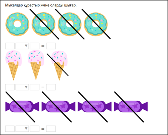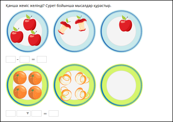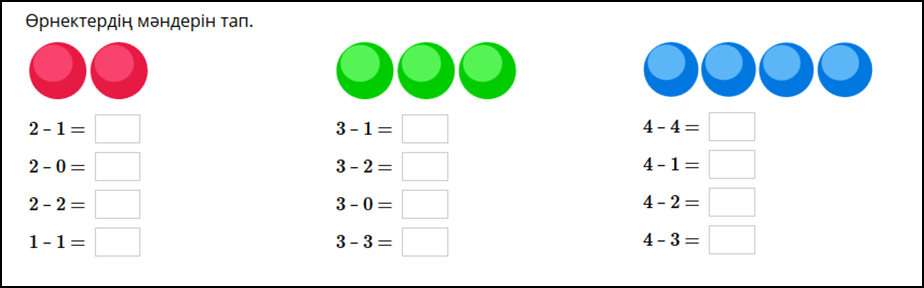 Дескриптор: Суреттер бойынша өрнектердің мәнін есептеуді түсіндіреді-жарайсың! Суреттер бойынша өрнектердің мәнін есептеуді түсіндіруде қиналады, көмек қажет етеді-жақсы! Өрнектердің мәнін дұрыс есептейді, жазады, есептің шешуін дұрыс табады -жарайсың! Өрнектердің мәнін дұрыс есептейді, жазады, есептің шешуін табуда қателеседі-жақсы! Өрнектердің мәнін дұрыс есептейді, жазады, есептің шешуін табуда қиналады-талпын! Тапсырманы дұрыс орындайды-жарайсың!