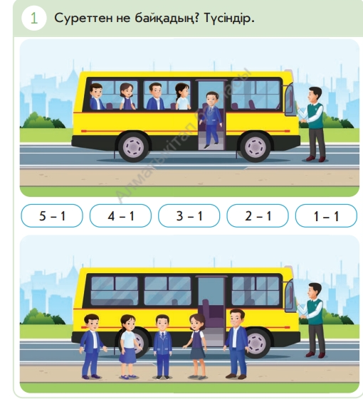 Тапсырма орындайды Ондықтан аттамай бір таңбалы сандарды ауызша қосу және азайтуды орындайды; Әнге қосылып айтады, билеп сергиді. Қосу мен азайту амалдарының компоненттері атауларын өрнектерді оқу мен жазуда қолданады Тапсырма орындайды Тапсырма орындайды