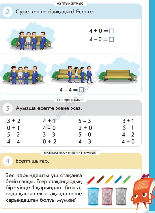 3 + 2=5 4 + 1=5 0 + 1=1 4 – 0=4 5 – 2=3 3 – 3=0 4 – 4=0 0 + 2=2 3 тапсырма: Дәптермен жұмыс Ауызша есепте және жаз. 5 – 3= 2 3 + 1=4 2 + 0=2 5 – 1=4 5 – 0=5 4 – 2=2 4 – 3 =1 4 + 0=4 4 тапсырма: Есепті шығар.Ф.С Бес қарындашты үш стақанға бөліп салды. Егер стақандардың біреуінде 1 қарындаш болса, онда қалған екі стақанда неше қарындаштан болуы мүмкін?