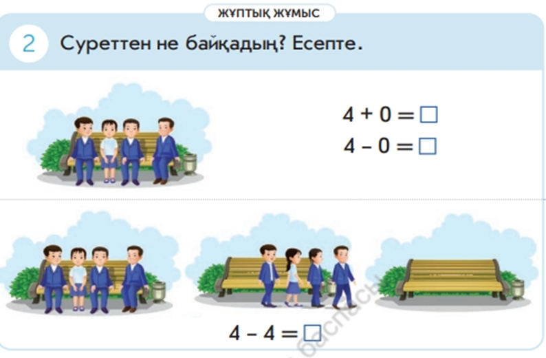 Түсіндір. 5 – 1 =4 3 – 1=2 1 – 1=0 4 – 1 =3 2 – 1=1 -Автобуста бала қалды ма? -Жоқ дегенді 0 цифрымен белгілей аламыз. 2) Суреттен не байқадың? Есепте. 4 + 0 =4 4 – 0 =4 4 – 4 =0 ЕБҚ оқушыға: 10-ға дейін тура және кері сана. Сергіту сәтінде «Санамақ» айтамыз (Ж.Ж) 2- тапсырма «Бірлескен жұмыс» әдісі.