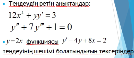Жаңа тақырыпты игерту. Дифференциалдық теңдеулер — ізделінетін функцияны оның әр түрлі ретті туындыларымен (немесе дифференциалдарымен) және тәуелсіз айнымалылармен байланыстыратын теңдеулер. Алгебралық теңдеулермен салыстырғанда, дифференциалдық теңдеулерді шешу кезінде функция (функциялар отбасы) ізделінеді, ал алгебралық теңдеулерді шешу нәтижесінде сан (бірнеше сан) ізделінеді. Біріншісінен жоғары ретті дифференциалдық теңдеуді бірінші ретті теңдеулер жүйесіне айналдыруға болады. Бұл жүйесіне кіретін теңдеулер саны бастапқы дифференциалдық теңдеудің ретіне тең. Ізделінді функцияның ең жоғарғы туындысы (дифференциалы) теңдеудің реті деп аталады. Теңдеуді қанағаттандыратын, яғни тепе-теңдікке айналдыратын функция теңдеудің шешімі деп аталады. Слайдта мысалдар көрсетіледі.