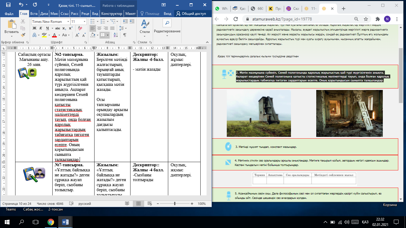 №12-тапсырма: Ғылыми еңбектерді пайдаланып, Қазақстанның экологиялық жағдайы туралы шағын мәтін жаз. Ескерту: таңдалған жанрдың формасы мен мазмұны сақталсын. |
