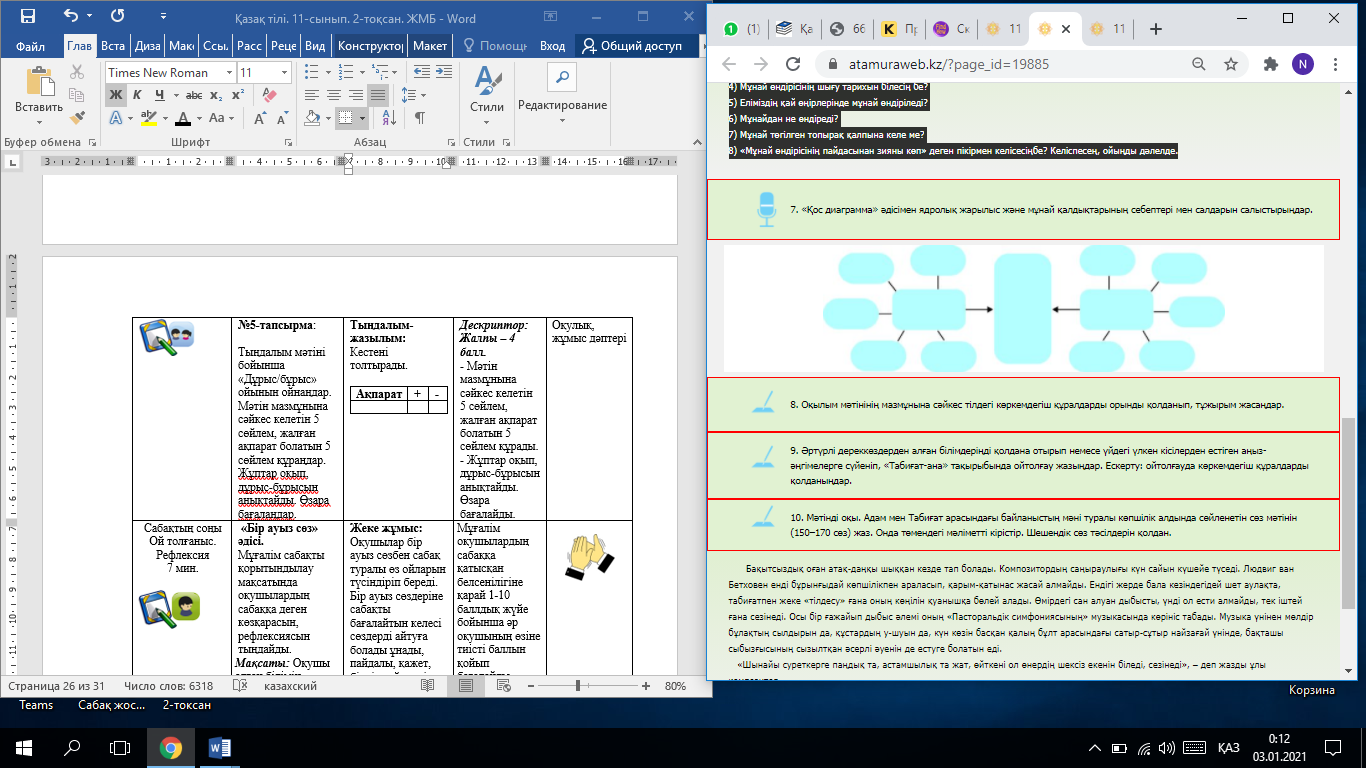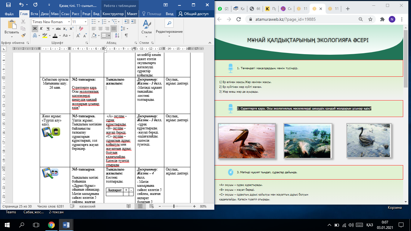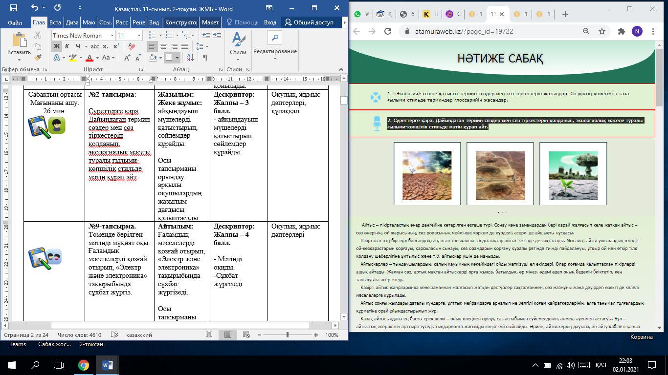 Осы тапсырманы орындау арқылы оқушылардың жазылым-айтылым дағдысы қалыптасады. Дескриптор: Жалпы – 3 балл. - термин сөздер мен сөз тіркестерін қолданып, экологиялық мәселе туралы ғылыми-көпшілік стильде мәтін құрап айтады. |