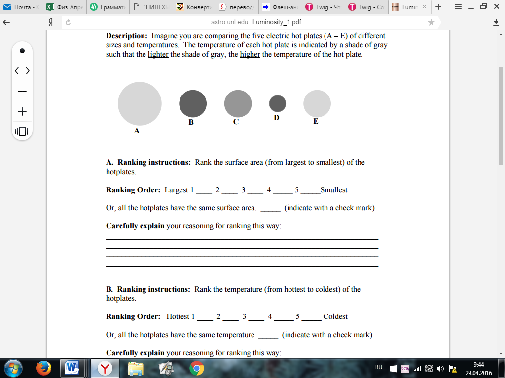 Тасырма-3. Сіздер өлшемдері мен температуралары әр түрлі болатын бес (А - Е) электрлік конфорканы салыстырып жатырсыз деп есептейік. Әрбір плита сұр түстермен көрсетілген, бірақ сұр түс неғұрлым ақшыл болған сайын, конфорканың температурасы соғұрлым жоғары бола түседі.