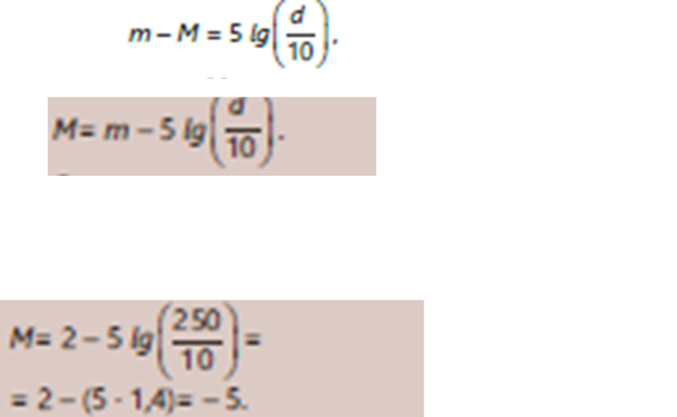 (G) Тасырма-2. 1-есеп. Көрінерлік жұлдыздық шамасы m=2 болатын жұлдыз 250 пк қашықтықта орналасқан. Осы жұлдыздың абсолютті жұлдызды шамасын анықтаңыз. Шешуі. Теңдеуден абсолютті жұлдыздық шаманы өрнектеп аламыз