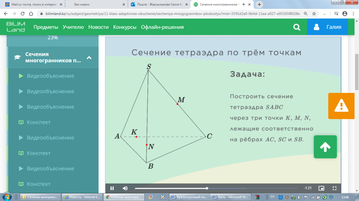 Бекіту тапсырмаларын орындау 1-тапсырма Үш нүкте арқылы тетраэдрдың қимасын салу