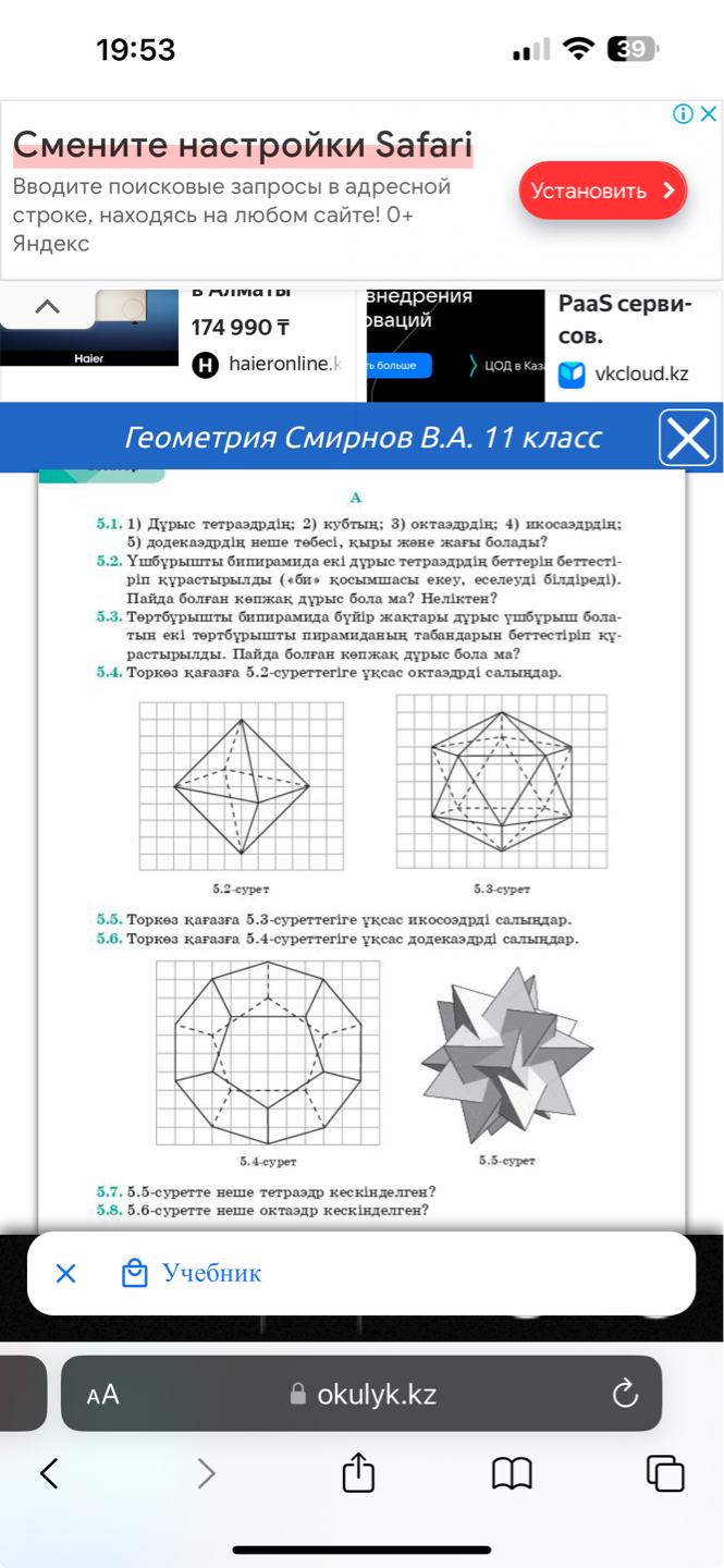 а) . Тест. 1) Қандай дұрыс көпжақтың жиырма төбесі бар? a) Тетраэдр b) Октаэдр c) Додекаэдр d) Икосаэдр 2) Қандай дұрыс көпжақта бір төбесіндегі барлық жазық бұрыштардың қосындысы 240о–қа тең? a) Куб b) Октаэдр c) Додекаэдр d) Икосаэдр 3) Дұрыс көпжақтарға қатысты қандай тұжырым дұрыс емес? a) Тек үш дұрыс көпжақтың ғана жақтары дұрыс үшбұрыш болады. b) Тек бір дұрыс көпжақтың ғана жағы квадрат болады. c) Тек бір дұрыс көпжақтың ғана жағы дұрыс алтыбұрыш болады. d) Тек бір дұрыс көпжақтың ғана жағы дұрыс бесбұрыш болады. 4) Қандай дұрыс көпжақтың он екі жағы бар? a) Куб b) Октаэдр c) Додекаэдр d) Икосаэдр 5) Дұрыс икосаэдрдің барлық жақтары дұрыс ... a) Үшбұрыштар b) Квадраттар c) Бесбұрыштар d) Алты бұрыштар 6) Дөңес көпжақ дұрыс деп аталады, егер оның жақтары: a) Дұрыс көпбұрыштар b) Тең көпбұрыштар c) Көпбұрыштар d) Тең дұрыс көпбұрыштардың қабырғаларының саны көпжақтың әр төбесіндегі қырлардың санына тең |