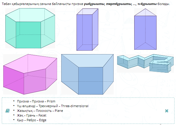 11.3.12 – призма көлемін табу формуласын білу және оны есептер шығаруда қолдану; |