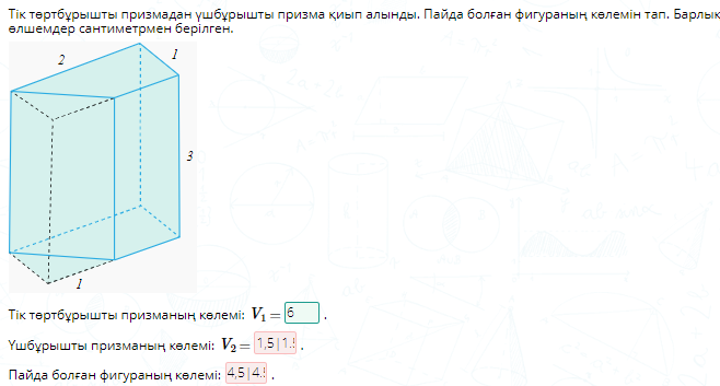 Дескриптор: -Тік төрбұрышты призманың көлемін табады -үшбұрышты призманың көлемін тап; Қиылған фигураның көлемін табады |