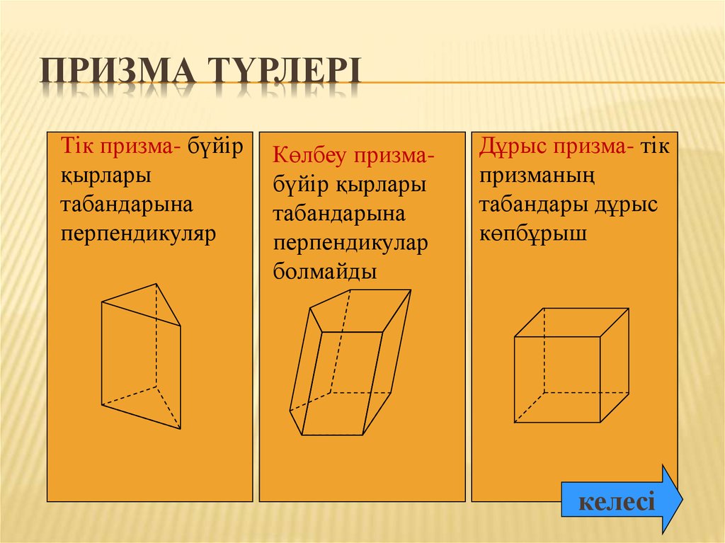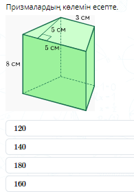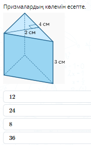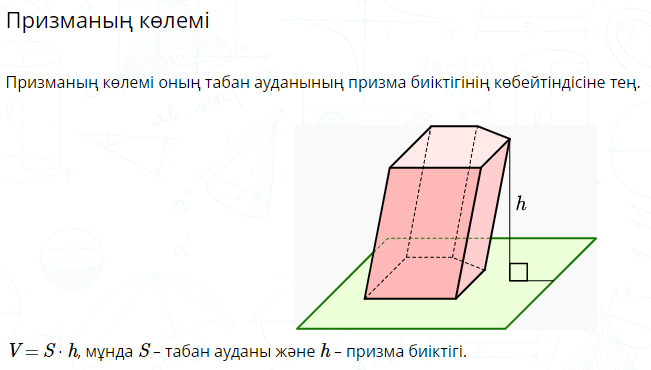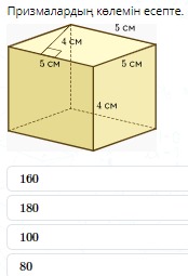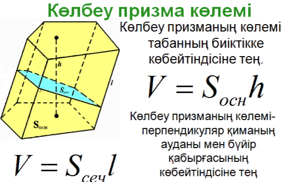 – призма көлемін табу формуласын біледі және оны есептер шығаруда қолданады; |