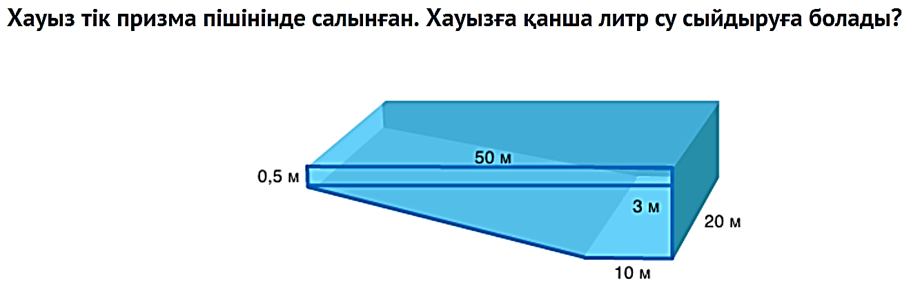 4-тапсырма Тік призманың табаны қабырғалары 10, 10 және 12 болатын үшбұрыш. Кіші бүйір жағының диагоналі табанымен 600бұрыш жасайтын болса, көлемін табыңыз 5-тапсырма. Тік призма пішінде салынған бассейнге қанша литр су сыйдыруға болатынын есептеңіздер. Жауабы: 2000 м3