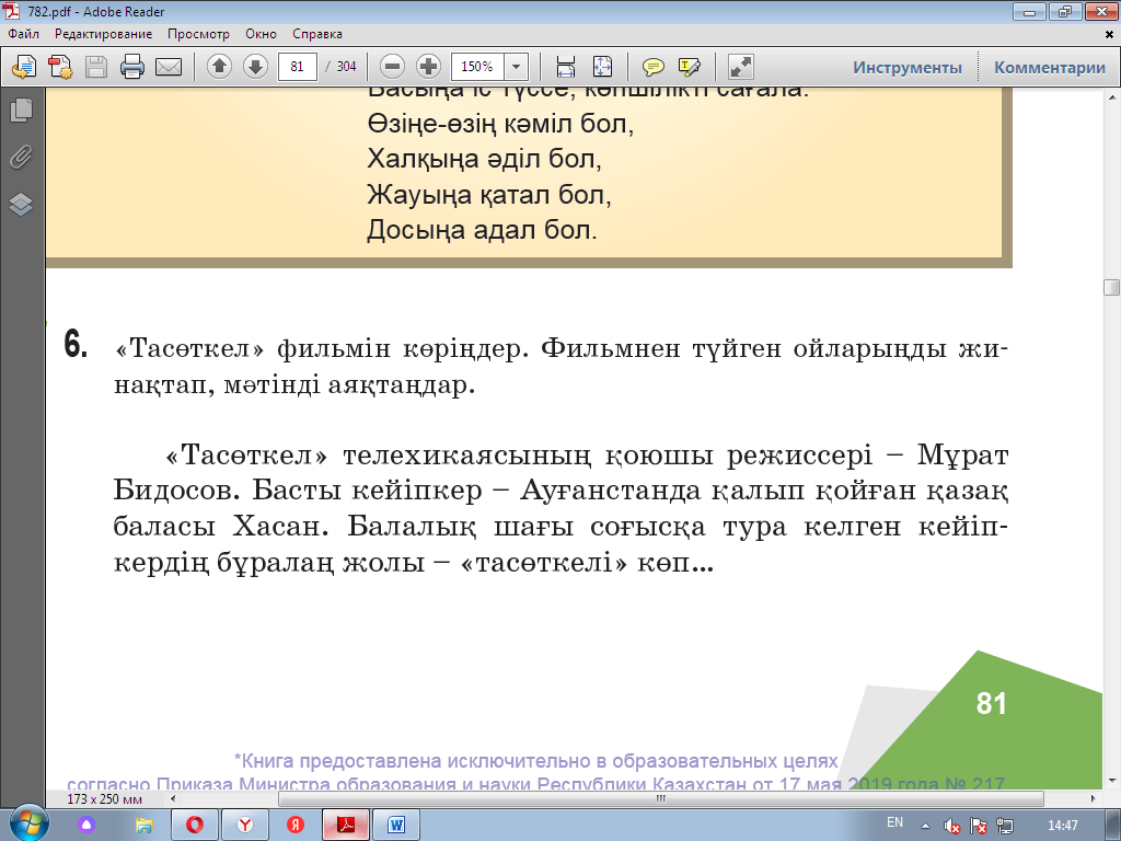№7-тапсырма. «Тасөткел» фильмін көріңдер. Фильмнен түйген ойларыңды жинақтап, мәтінді аяқтаңдар. |