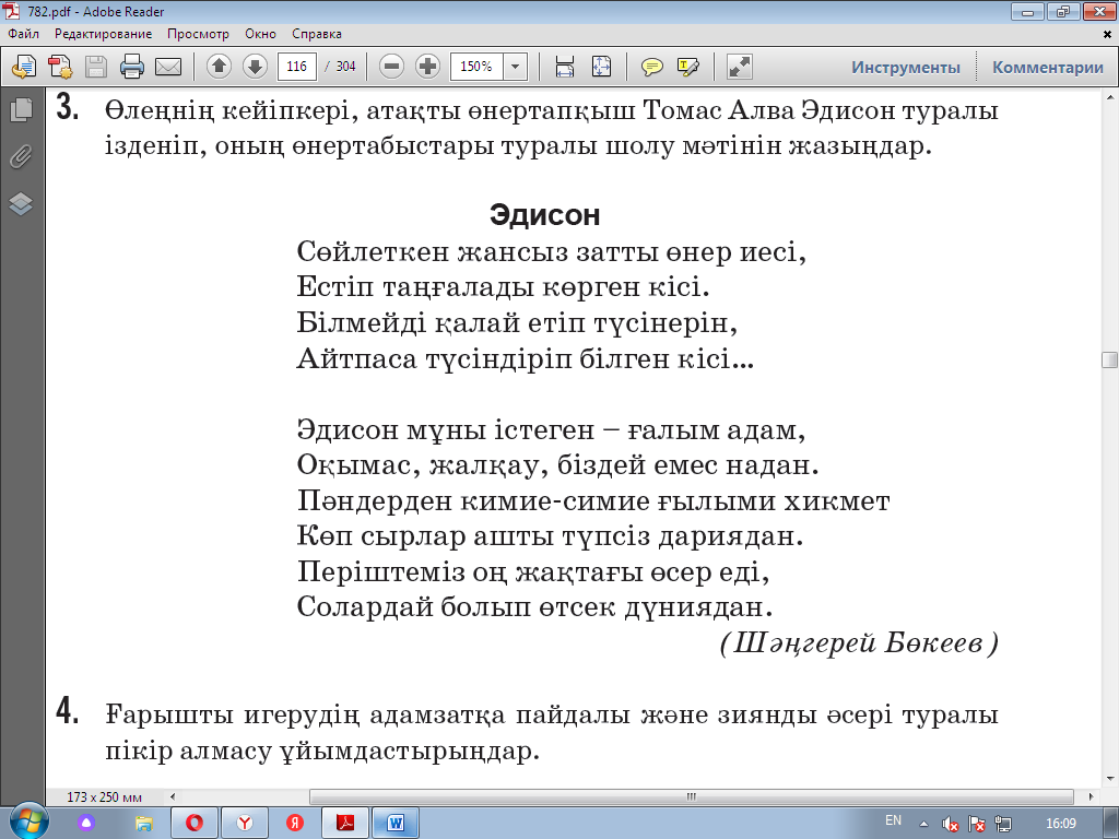 №9-тапсырма: Өлеңнің кейіпкері, атақты өнертапқыш Томас Алва Эдисон туралы ізденіп, оның өнертабыстары туралы шолу мәтінін жазыңдар |