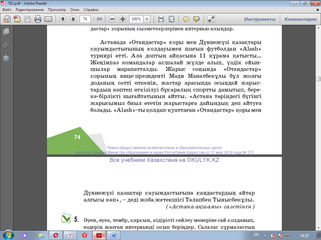 Әуен,әуез, тембр, қарқын, кідірісті сөйлеу мәнеріне сай қолданып, өздерің жазған интервьюді оқып беріңдер. Салалас құрмаластың түрлерін ажыратыңдар. |