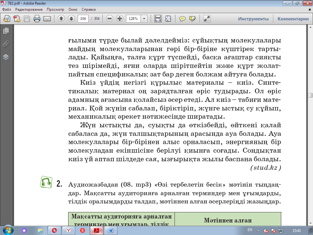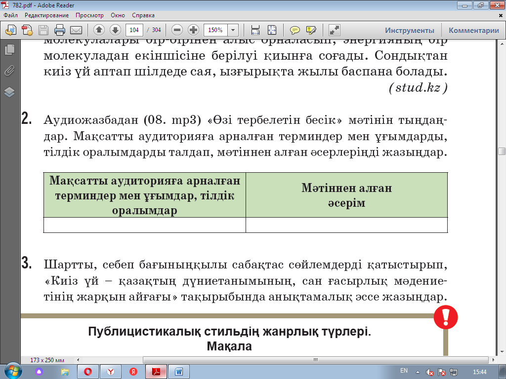 №8-тапсырма. Аудиожазбадан «Өзі тербетілген бесік» мәтінін тыңдаңдар. Мақсатты аудиторияға арналған терминдер мен ұғымдарды, тілдік оралымдарды талдап, мәтіннен алған әзерлеріңді жазыңдар. |