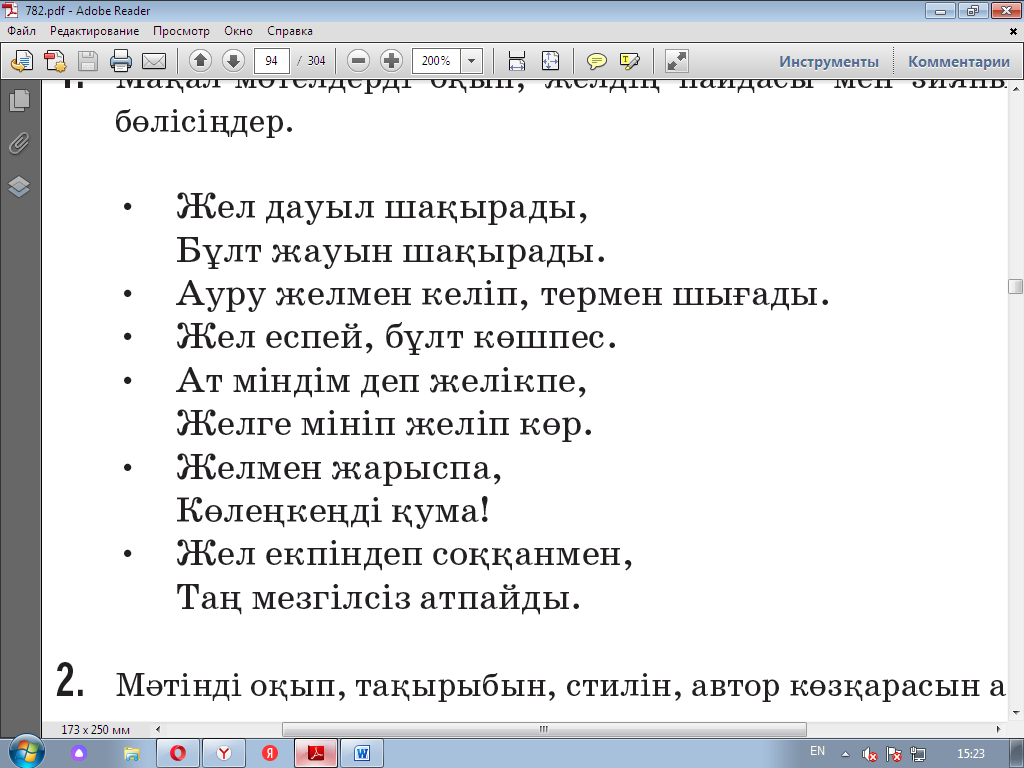 Мақал-мәтелдерді оқып, желдің пайдасы мен зияны туралы ой бөлісіңдер.