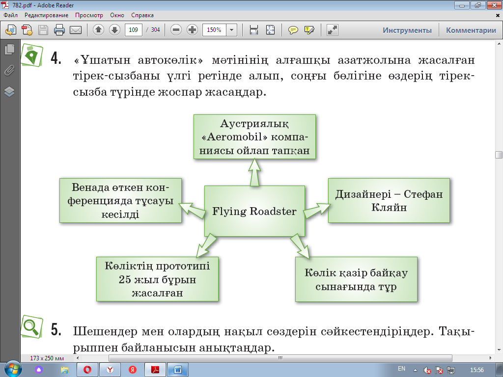 №8-тапсырма. «Ұшатын автокөлік» мәтінінің алғашқы азатжолына жасалған тірек-сызбаны үлгі ретінде алып, соңғы бөлігіне өздерің тірке-сызба түрінде жоспар жасаңдар. |