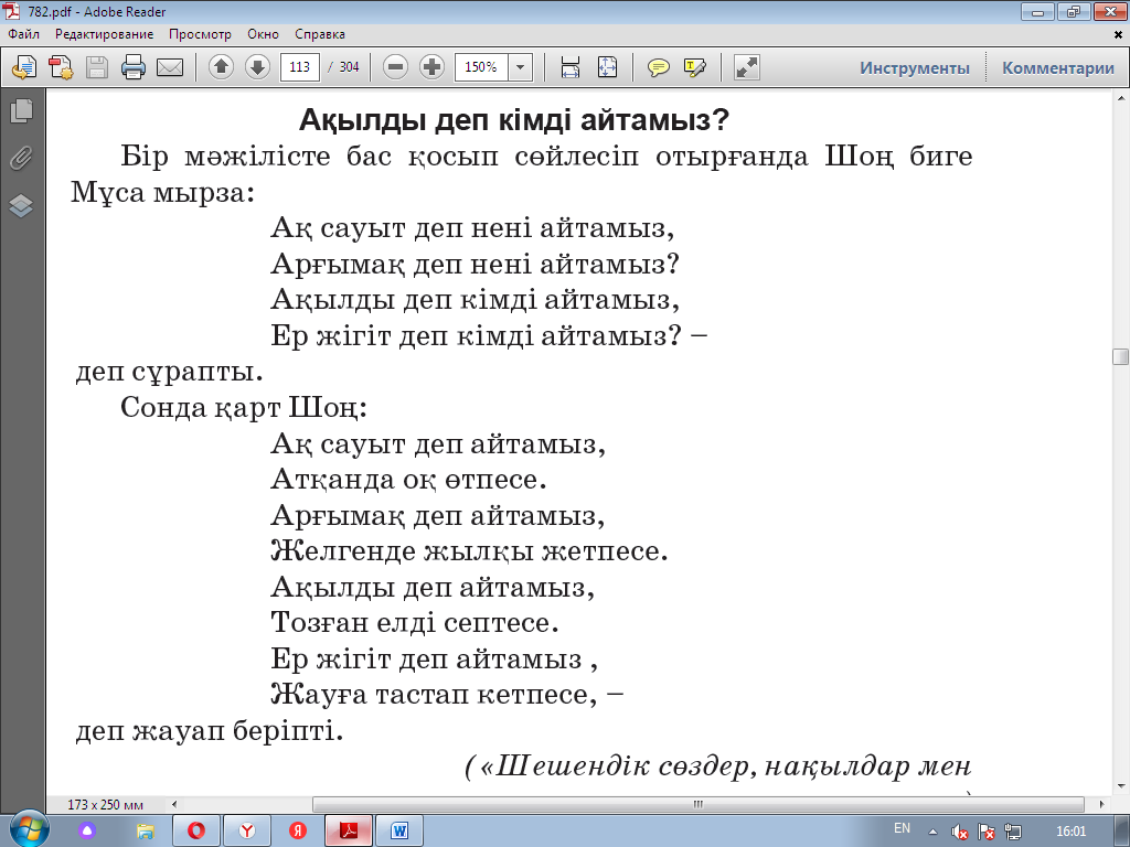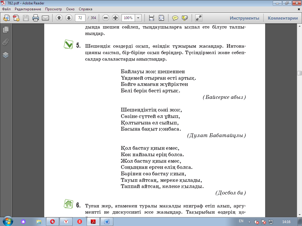 №2-тапсырма: Шешендік сөздерді оқып, өзіндік тұжырым жасаңдар. Интонацияны сақтап, бір-біріңе оқып беріңдер. Түсіндірмелі және себеп-салдар салаластарды анықтаңдар. |