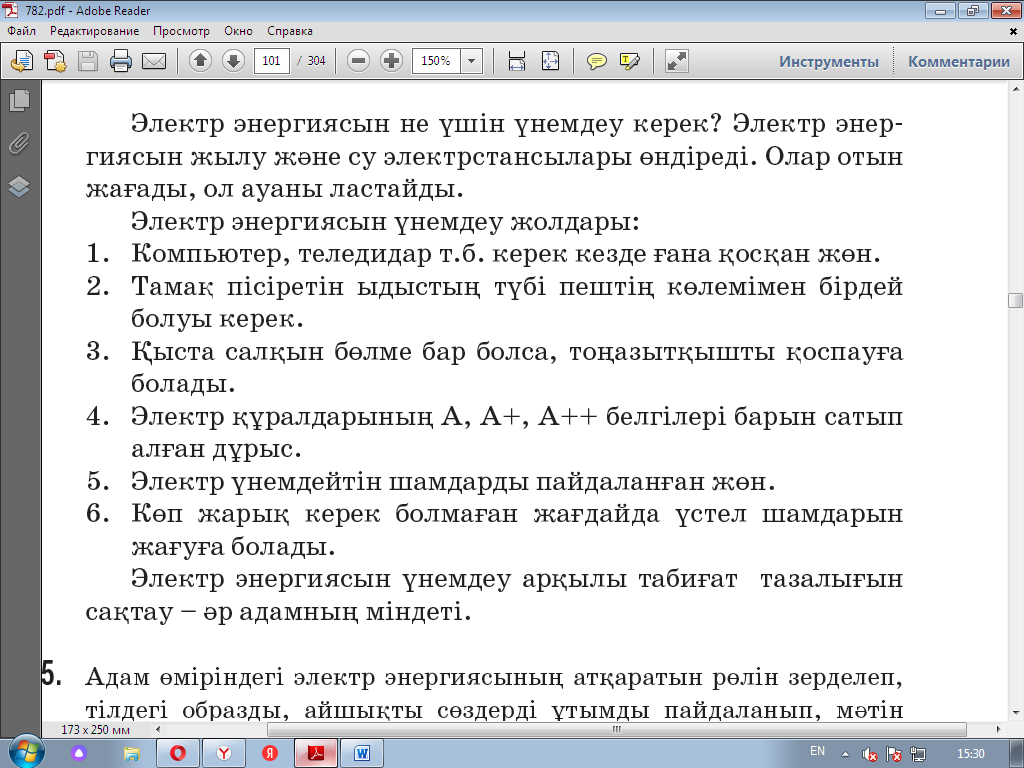 Адам өміріндегі электр энергиясынның атқаратын рөлін зерделеп, тілдегі образды, айшықты сөздерді ұтымды пайдаланып, мәтін жазыңдар. Сабақтас құрмалас сөйлемдерді қатыстырыңдар және түрлерін ажырыатыңдар. Дескриптор: Жалпы-3 балл. - Мәтін жазады |