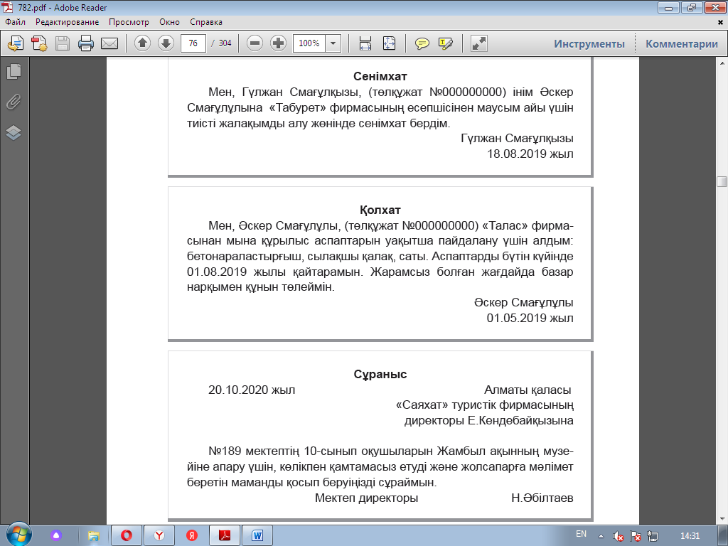 №7-тапсырма. Берілген үлгілерді негізге алып, ісқағаздардың бірнешеуін жазыңдар. Ережеде аталған ісқағаздардың тағы қай түрінің жазылу үлгісін білесіңдер? |