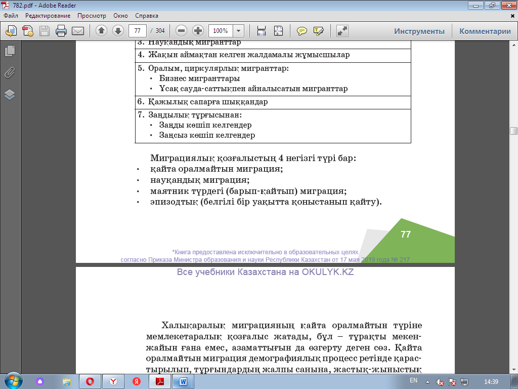 Барлық оқушылар үшін: Білім алушылар миграция және оның түрлері туралы ақпаратпен, тақырыпқа қатысты термин мөздердің мағнасын түсінеді. |