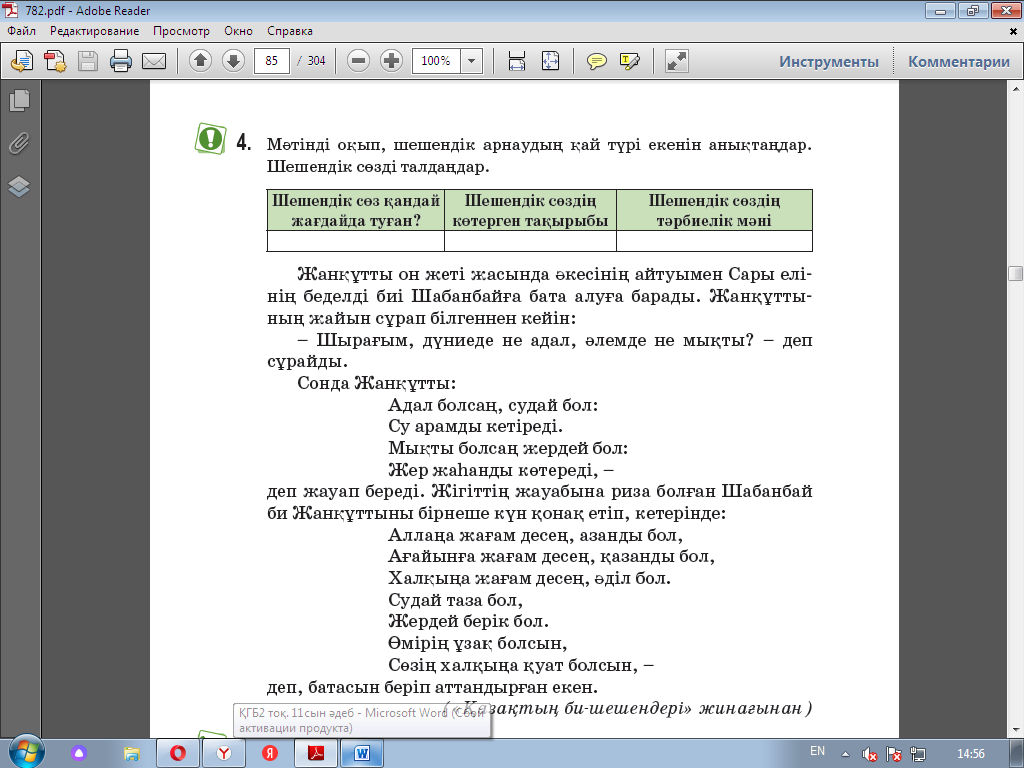 №4-тапсырма Мәтінді оқып, термелі сөзбен берілген шешендік сөзді пернелі сөзге айналдырыңдар. |